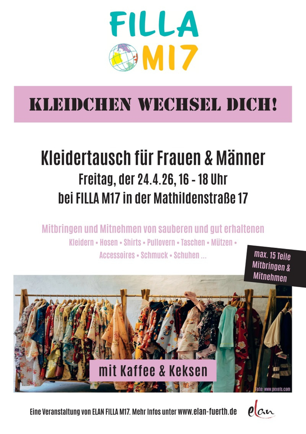 Unser Frühjahrs-Kleidertausch findet wieder statt, diesmal in unseren Räumen in der Mathildenstraße 17 – am 24.04. von 16.00 bis 18.00 Uhr. Wir freuen uns, wenn Sie das Plakat ausdrucken und Werbung für die Veranstaltung machen. Und natürlich noch mehr, wenn Sie vorbeikommen und mittauschen.